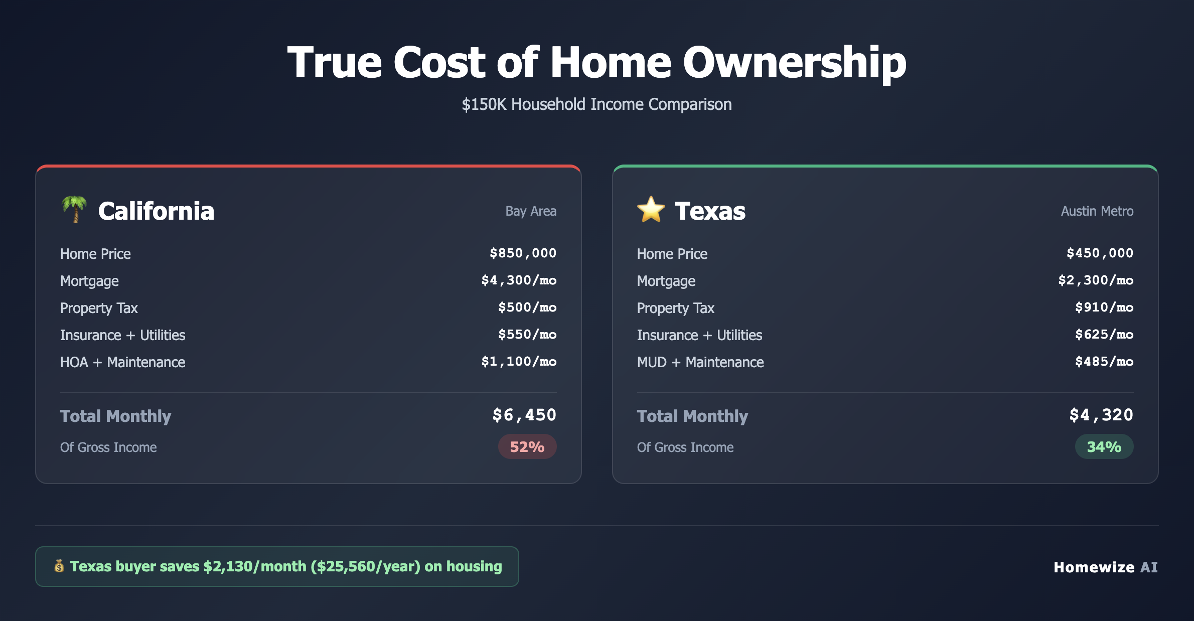 Let’s build out side-by-side scenarios for a buyer earning $150,000 household income in California vs Texas, showing how much of that income goes into true ownership costs.